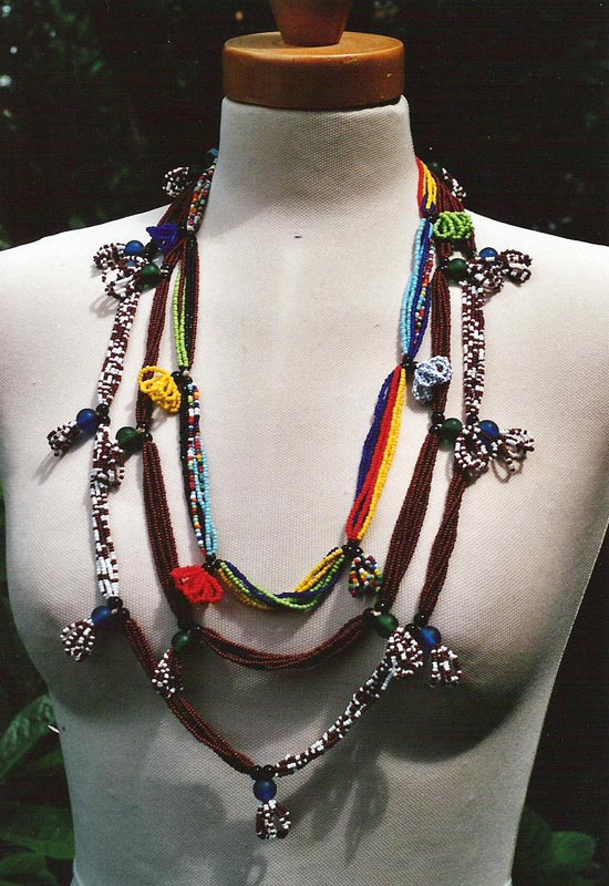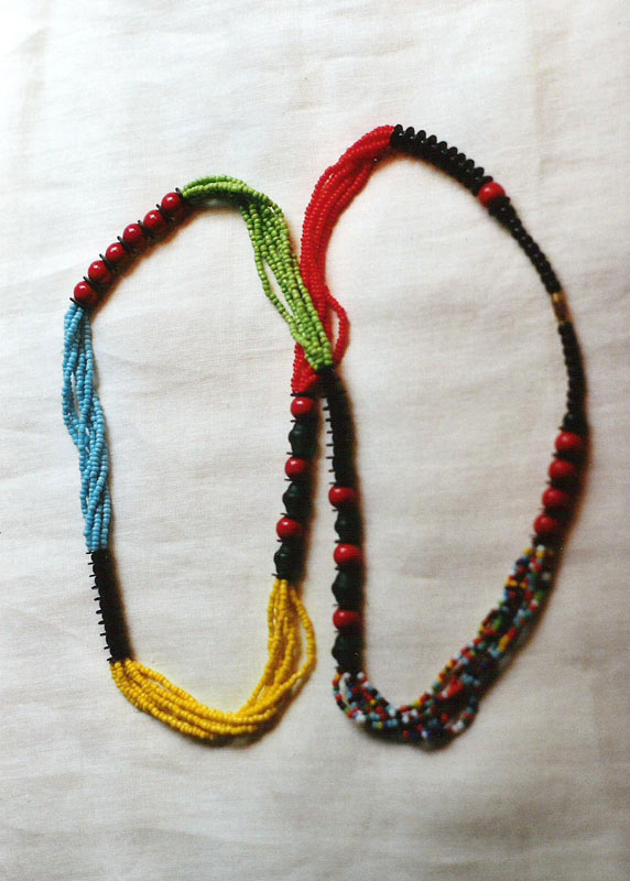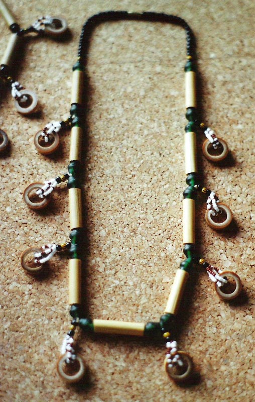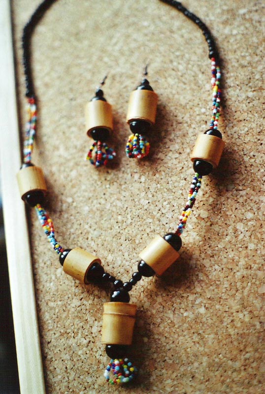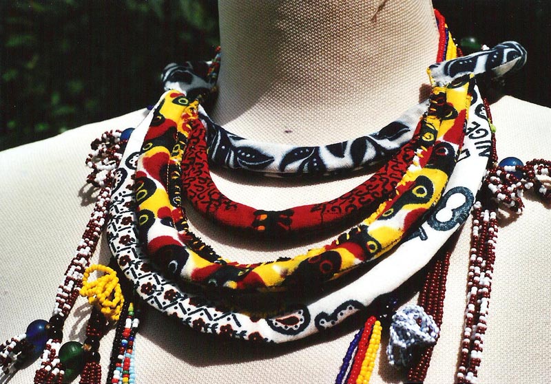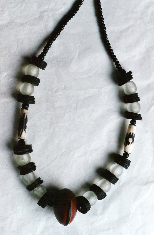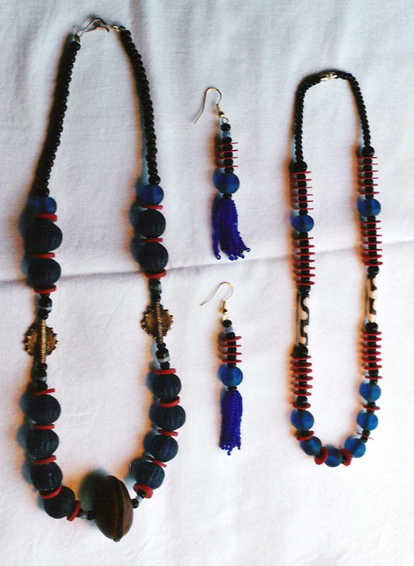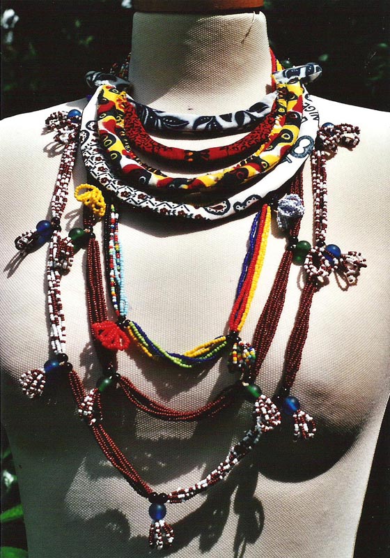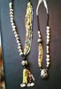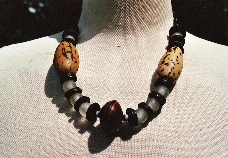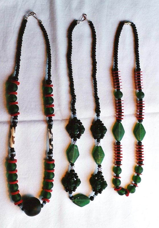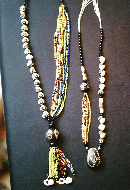 Matières : métaux, cuivre, argent - bois, bambou, ébène - perles de verre anciennes et modernes, agathes - graines diverses - coquillages - terres.
