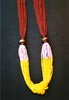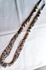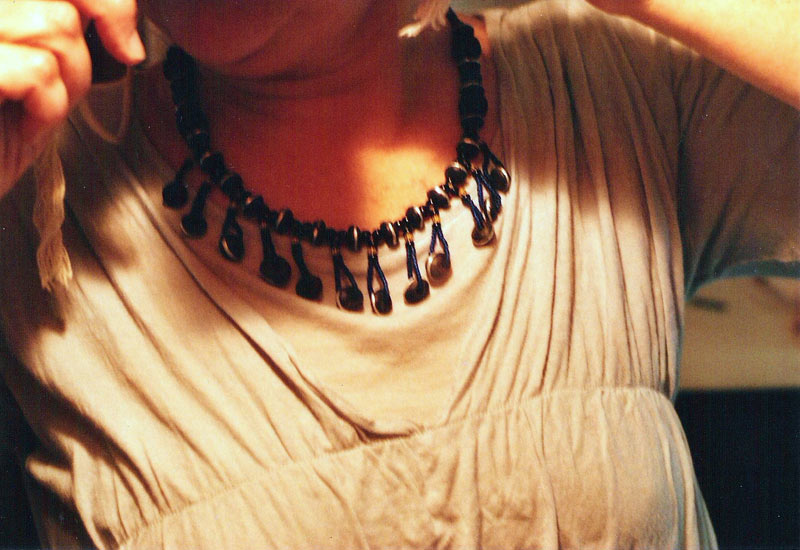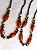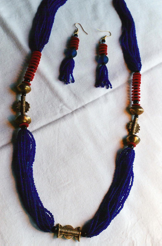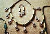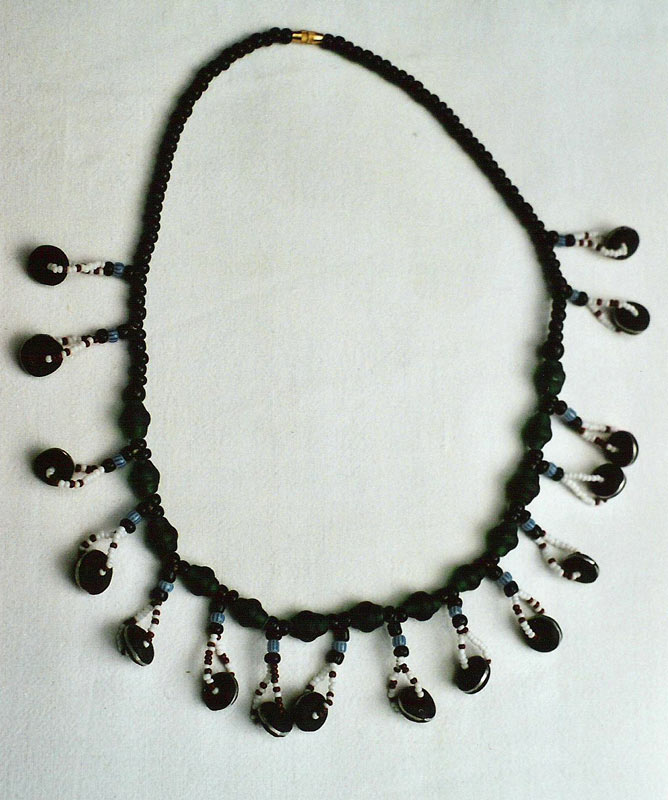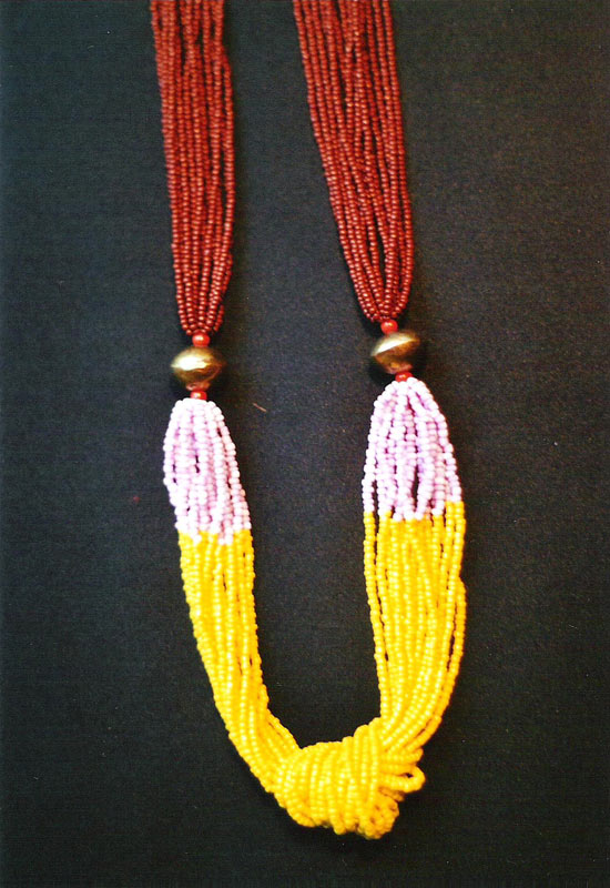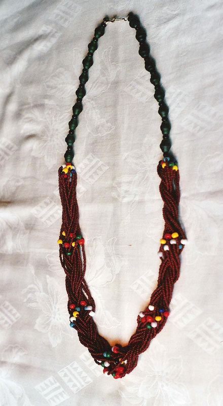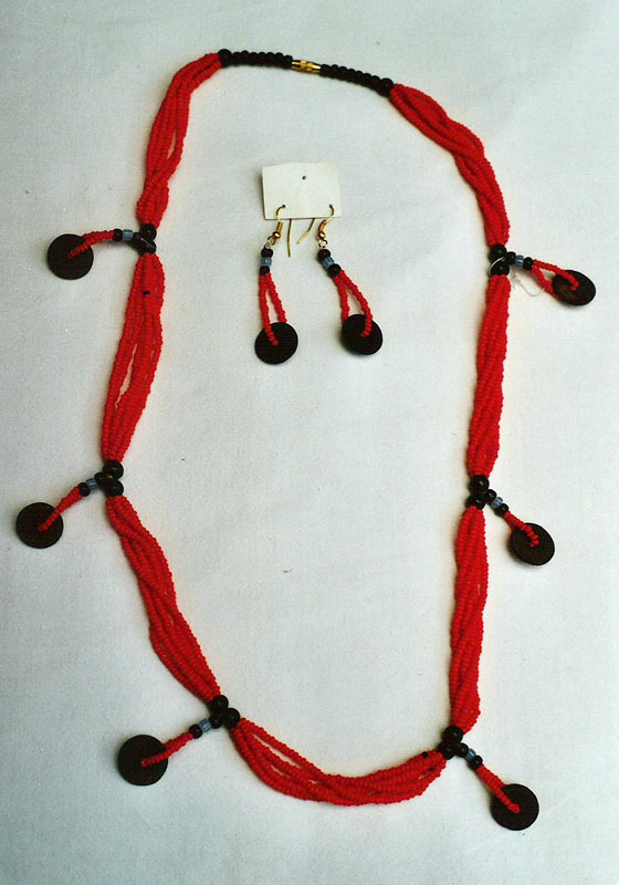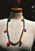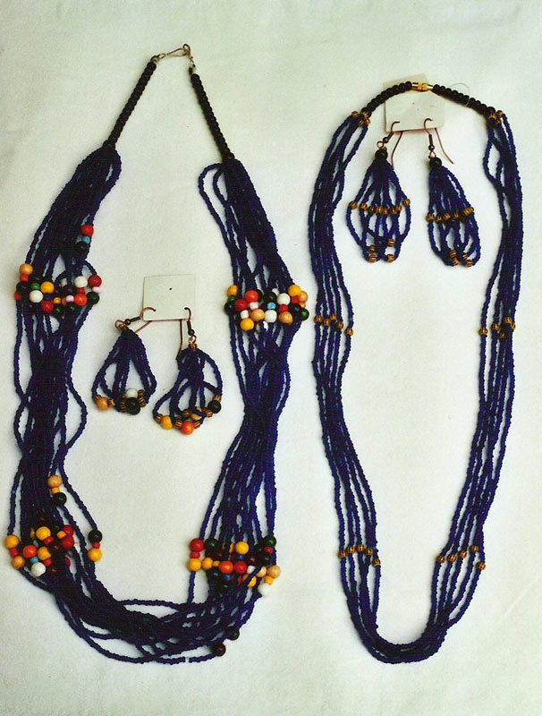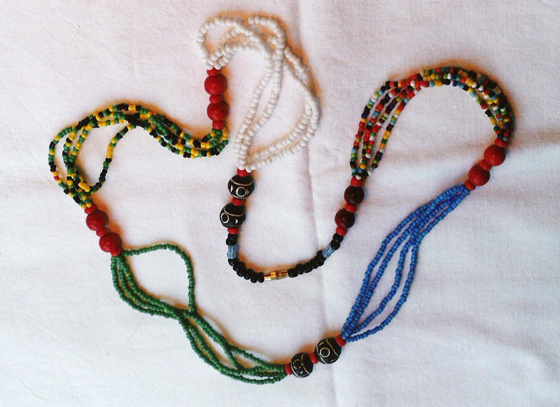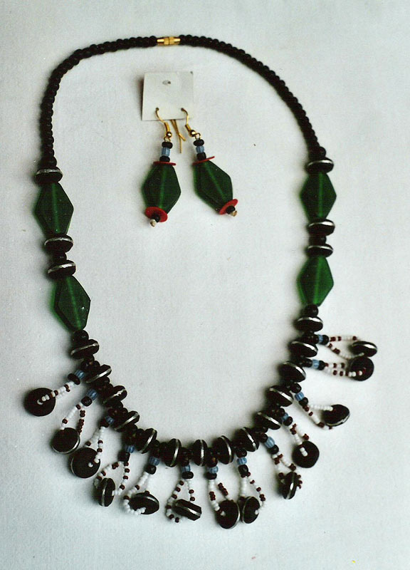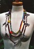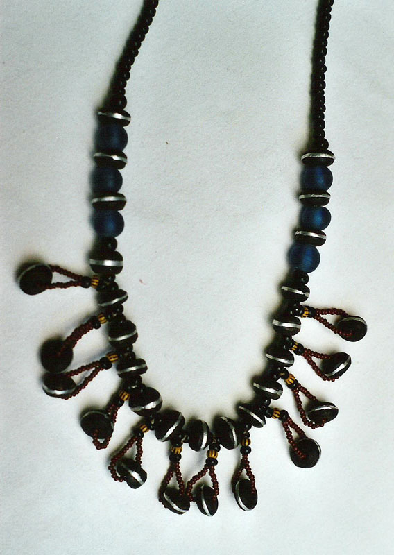 Matières : métaux, cuivre, argent - bois, bambou, ébène - perles de verre anciennes et modernes, agathes - graines diverses - coquillages - terres.